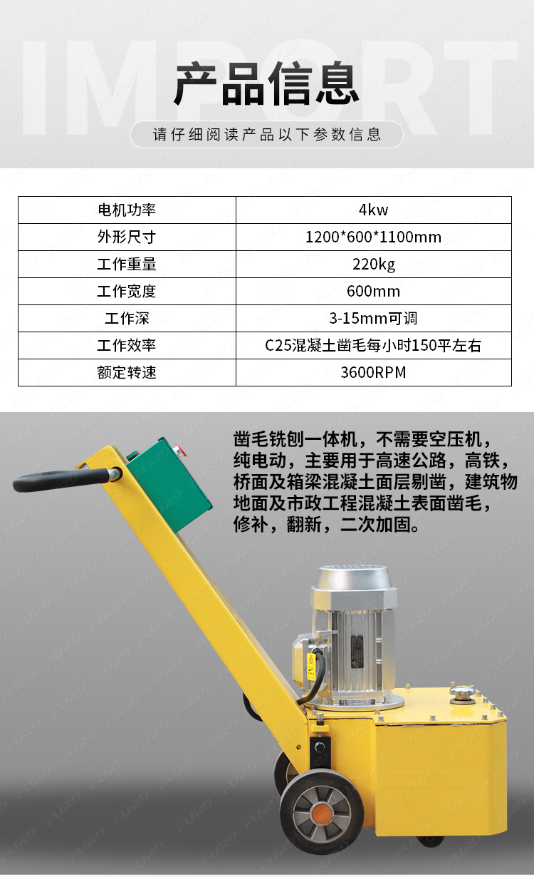 鑿毛銑刨一體機(jī),不需要空壓機(jī),純電動(dòng),主要用于高速公路,高鐵,橋面及箱梁混凝土面層剔鑿,建筑物地面及市政工程混凝土表面鑿毛,修補(bǔ),翻新,二次加固。