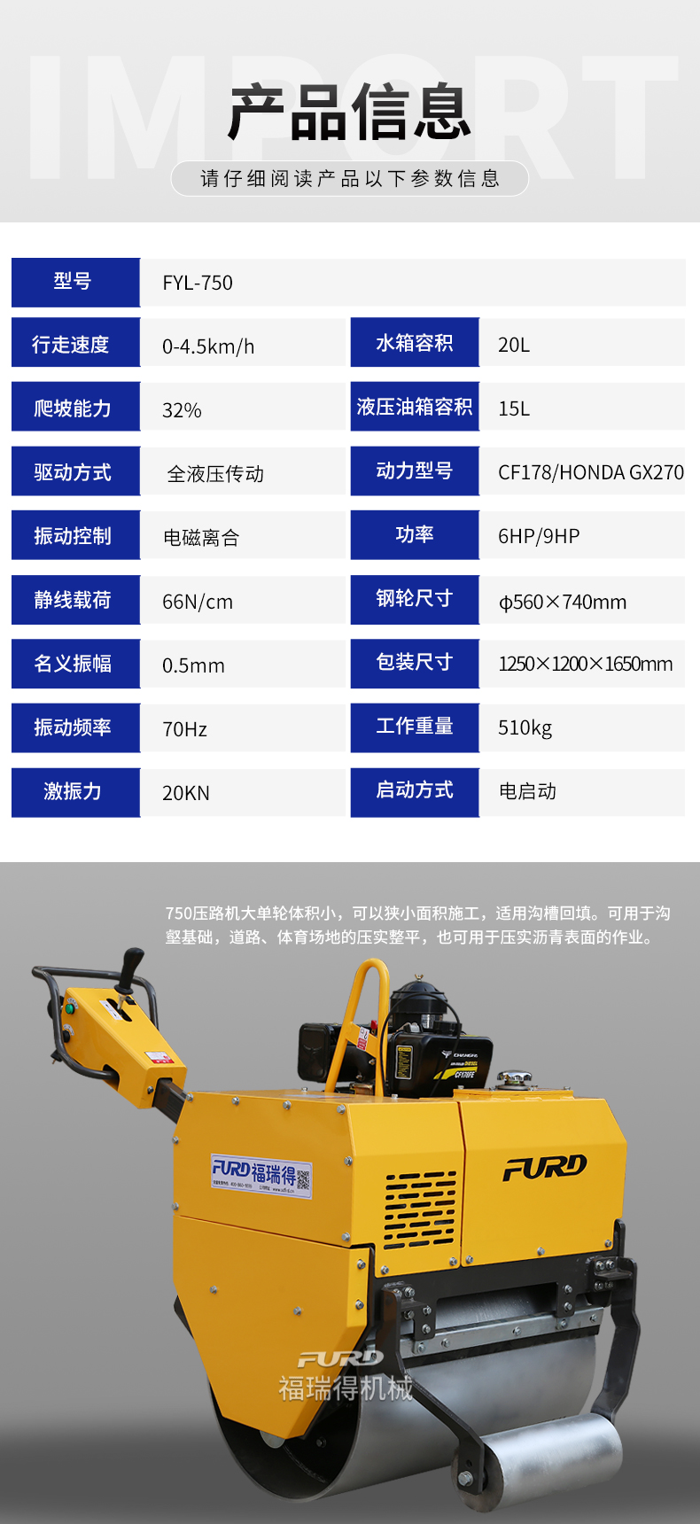 FYL-750 液壓手扶式單輪壓路機(jī)