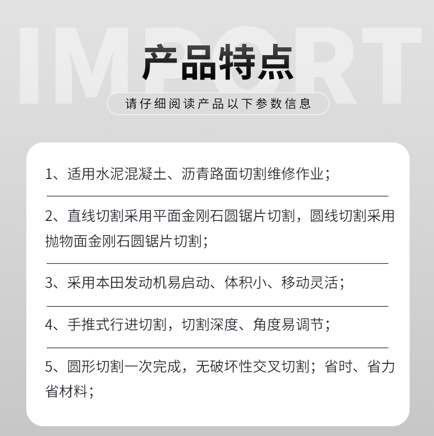 井周切縫機(jī)適合水泥混泥土、瀝青路面切割維修;既可以做直線路面切縫機(jī)使用,也可以做圓形路面切縫機(jī);獨(dú)特的圓形切割能力省去了普通切縫機(jī)多次交叉破壞性切割的麻煩,效率是普通切縫機(jī)的10倍以上。