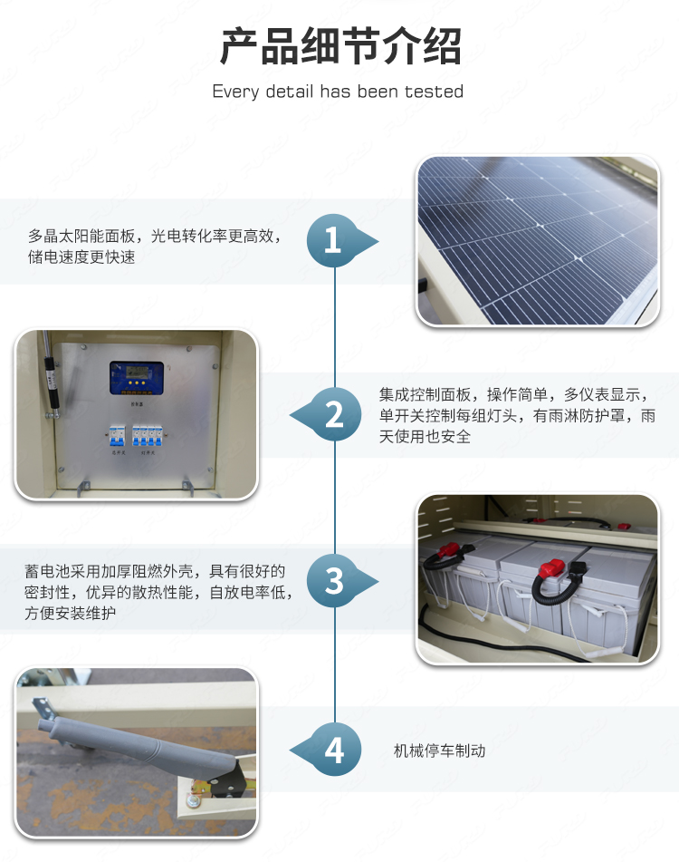 我們開發(fā)了一種新產(chǎn)品,叫做太陽(yáng)能光塔,它的設(shè)計(jì)理念是節(jié)能環(huán)保。它可以長(zhǎng)時(shí)間部署在偏遠(yuǎn)地區(qū),并由太陽(yáng)能自行供電。它通過可調(diào)節(jié)的太陽(yáng)能電池板自動(dòng)充電,運(yùn)行干凈,安靜,高效。
